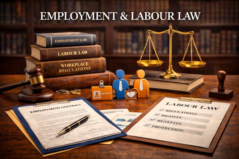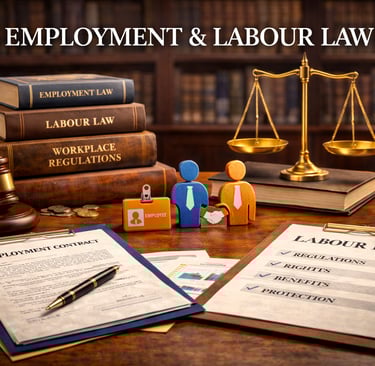 Employment and labour matters involve balancing statutory compliance, workplace relations, and individual rights. The practice focuses on structured advisory, compliance monitoring, procedural representation, and resolution of disputes through litigation or negotiation while protecting client interests.